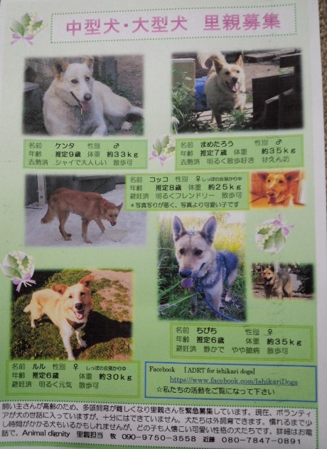 「犬の里親募集中!」 温かい家族を募集中です! 飼い主さんが高齢のため、多頭飼育が難しくなり里親さんを緊急募集しています。 そんなワンちゃん達の里親さんを募集しております。 外飼育できる中・大型犬雑種6歳〜9歳で全員避妊去勢済みです。 お問合せご質問はこちらまで・・・ 090-9750-3558(牧) ![]() どうかよろしくお願いいたします。m(__)m 上記の連絡先ではなく、「ペットステーション」に問い合わせていただいても結構です。 TEL:011-763-3990 よろしくお願いいたします。m(__)m |